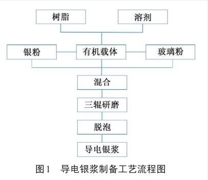 為了保證試驗的可重複性和對比性,試驗製備的導電銀漿中銀粉、玻璃粉比例均保持一緻,僅通過調整有機載體的加入量使導電銀漿的黏度一緻。本試驗采用80%銀粉、5%的Bi 2 O 3 -B 2 O 3 -SiO 2 -ZnO 系無鉛玻璃粉和15%左右的有機載體,按照圖1所示的工藝流程製備導電銀漿,研磨至細度小於5 μm,控製銀漿黏度為200~230 Pa·s。