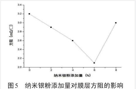 圖5為納米銀粉添加量對膜層方阻的影響,從圖5可看出,隨著納米銀粉用量的增加,方阻從 3.2mΩ/□逐漸降低,添加量2%時方阻為2.9 mΩ/□,當納米銀粉添加量為6%時,方阻最小,達到2.1 mΩ/□, 繼續增加納米銀粉加入量至8%時,方阻反而增大至3.0 mΩ/□。