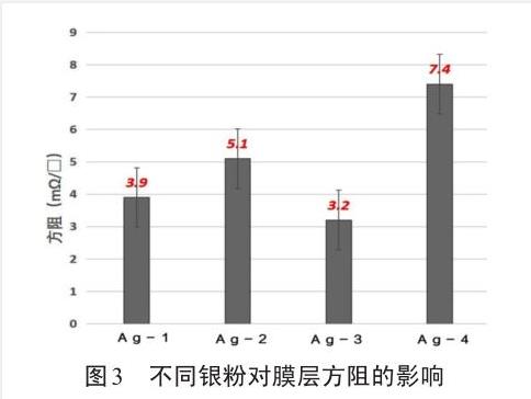 用4種銀粉分別製備了導電銀漿,印刷、燒結後測定銀膜性能。圖3是不同銀粉製備的導電膜層的方阻圖,從圖3可以看到,銀粉Ag-3製備的銀漿方阻最小為3.2 mΩ/□,導電性能最好,其次是銀粉Ag-1和Ag-2,分別為3.9 mΩ/□和5.1 mΩ/□,導電性能最差的是Ag-4銀粉,方阻為7.4 mΩ/□。結合銀粉的物理特性和形貌分析,Ag-3的分散性最好,且堆積密度最大為5.6 g/cm 3 ,燒結時銀粉的接觸點最多,更容易進行物質傳遞,形成緻密燒結;銀粉Ag-1和Ag-2堆積密度逐漸變小,粉體之間孔隙較多,所以燒結時較Ag-1銀粉差;銀粉Ag-4是不規則形狀,銀粉之間不易堆積,非常容易形成孔洞,導緻膜層緻密性降低,因此導電性能會降低。