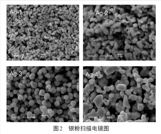 圖2是選用的4種銀粉的掃描電鏡照片。從圖2可看出,Ag-1為亞微米級不規則微晶銀粉,粒徑分布較寬,有少量團聚;Ag-2銀粉為不規則形狀,團聚程度低,分散性較好;Ag-3銀粉為類球形銀粉,顆粒尺寸較為均勻,團聚程度低,分散性較好;Ag-4銀粉粒徑分布寬,形貌不規則,為球形銀粉或微晶銀粉多個球體連接在一起。