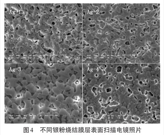 圖4是不同銀粉燒結膜層表面的掃描電鏡圖片。從圖4可見,Ag-1膜層比較緻密,孔洞少,燒結後晶粒尺寸小;Ag-2和Ag-4膜層孔洞較多,粉體燒結程度低,網絡結構疏鬆,且空洞分布不均勻,導緻導電性能降低;其中燒結性能能最好的是Ag-3,膜層緻密、均勻,且銀晶粒尺寸大,晶界少,銀顆粒連接緊密,分布均勻,導電性能優於其他3種銀粉,這也與方阻測試結果一緻。
