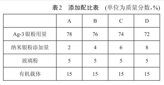 銀粉的粒徑和形貌對銀膜的導電性有較大的影響,按照Dinger-Funk粉體堆積理論,為了進一步提高膜層緻密性和導電性能,從增加粉體的燒結活性和提高粉體的填充性能兩個方面考慮,以Ag-3為主體銀粉,選用平均粒徑為50 nm的球形銀粉作為添加劑加入導電銀漿中,以期提高膜層的性能,在此基礎上,研究不同添加量形式下銀膜性能的變化情況,添加配比如表2所列。