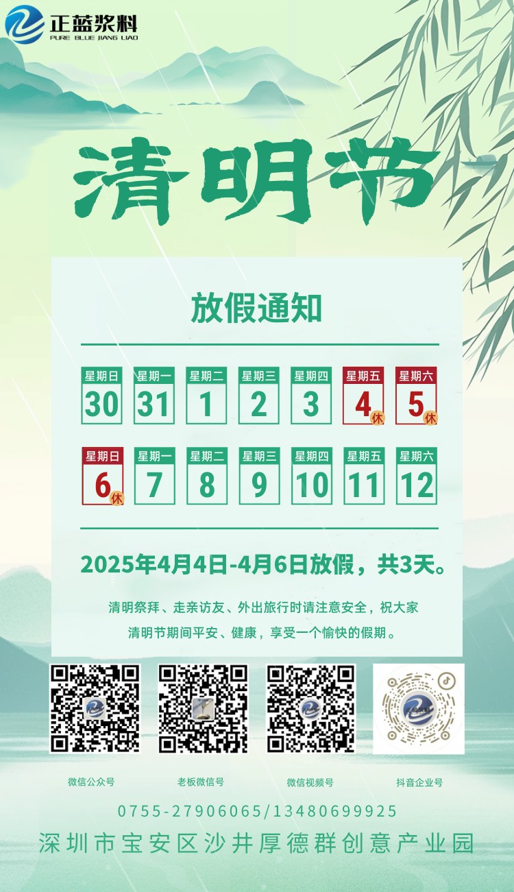 我司清明節放假時間為2025年4月4日(周五)至4月6日(周天),共3天。4月7日(周一)正常上班。
