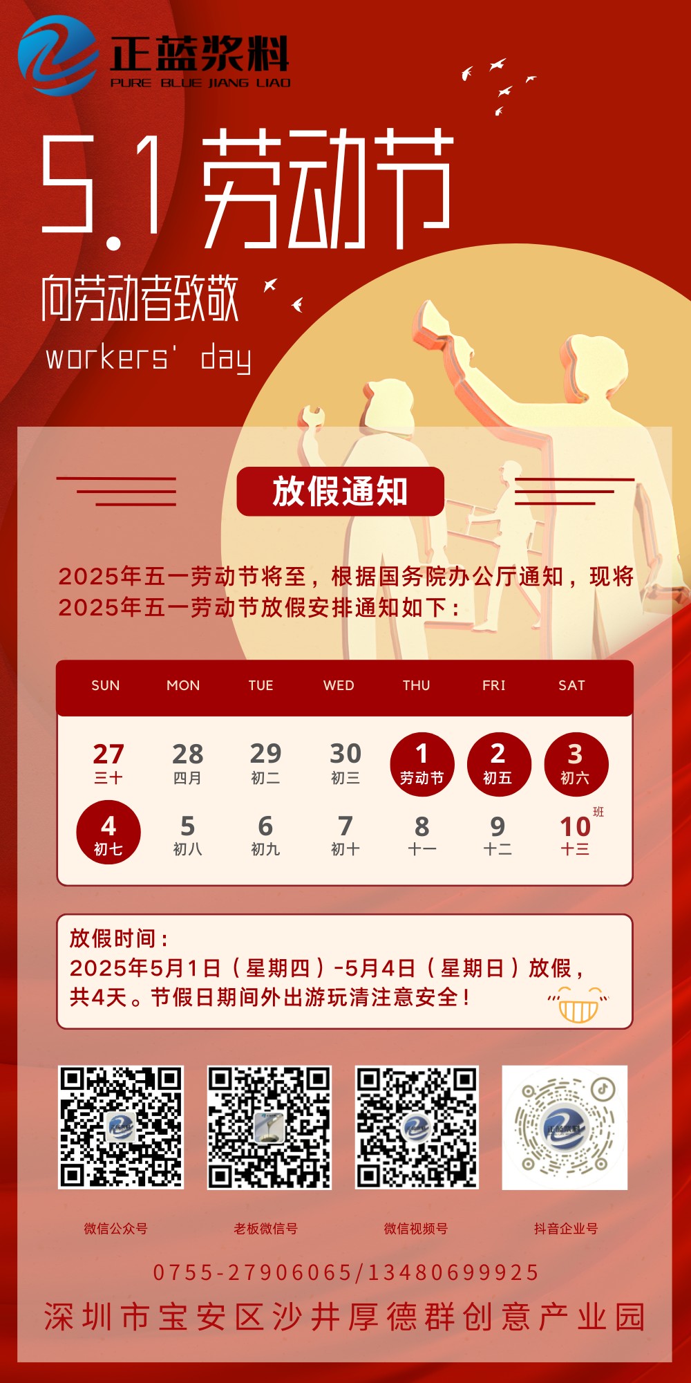 我司五一勞動節放假時間為2025年5月1日(星期四)至5月4日(星期日)放假,共4天。5月5日(周一)正常上班。